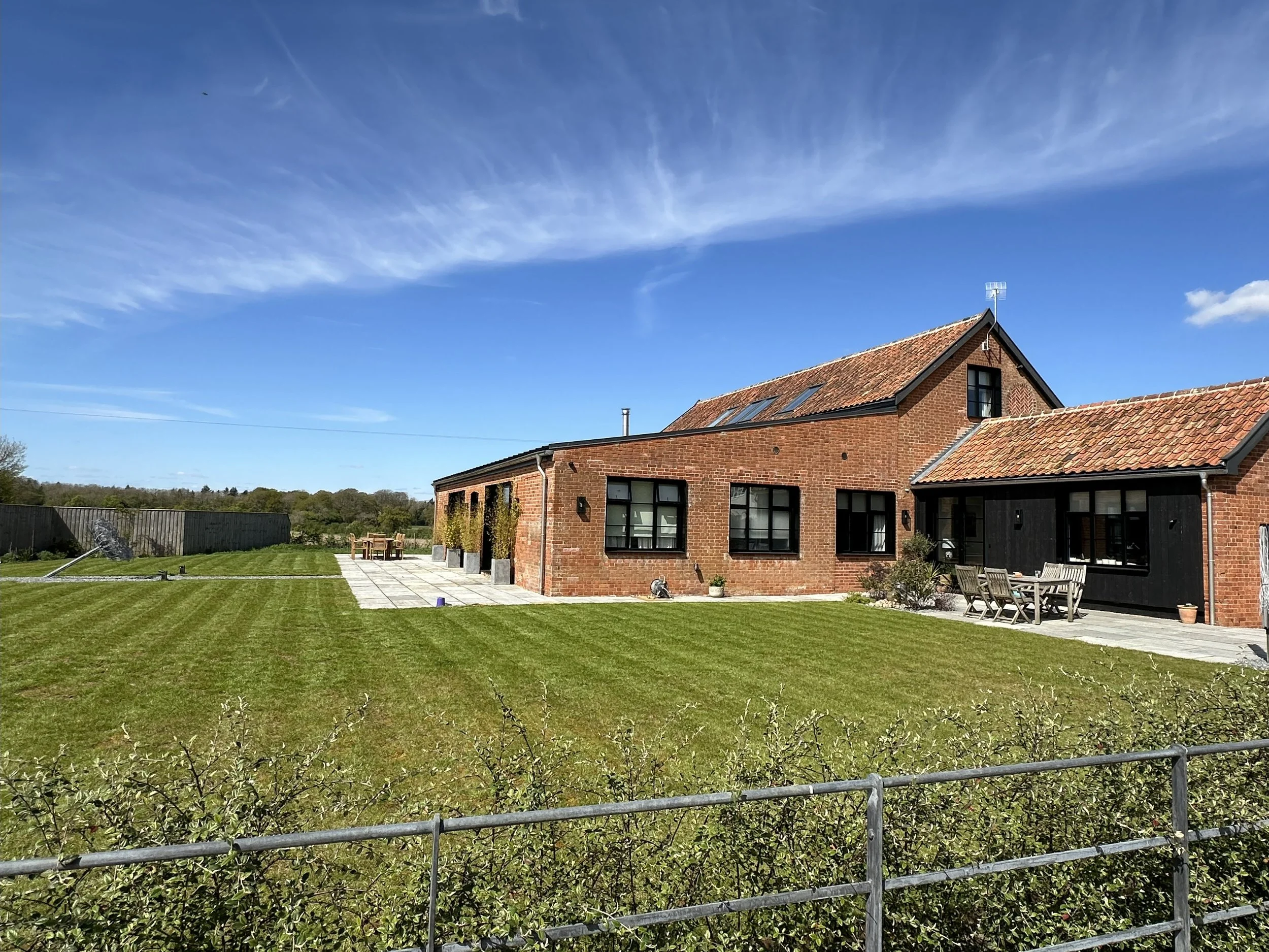 Externally, traditional brick elevations and clay tiled roofs maintain the building’s agricultural identity, while powder-coated steel windows and doors add a crisp, contemporary contrast. Large glazed openings frame views across the surrounding Suffolk landscape and connect the house to a series of terraces and outdoor spaces.